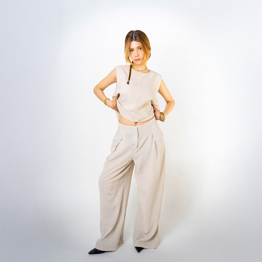 Dökümlü Bej Keten Bluz Pantolon Takım