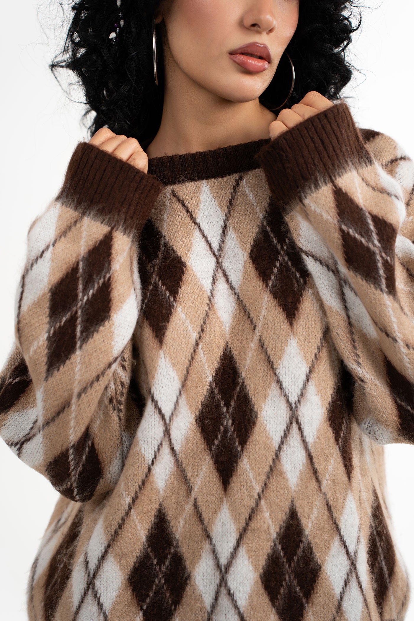 Baklava Desenli Bisiklet Yaka Kahverengi Kazak