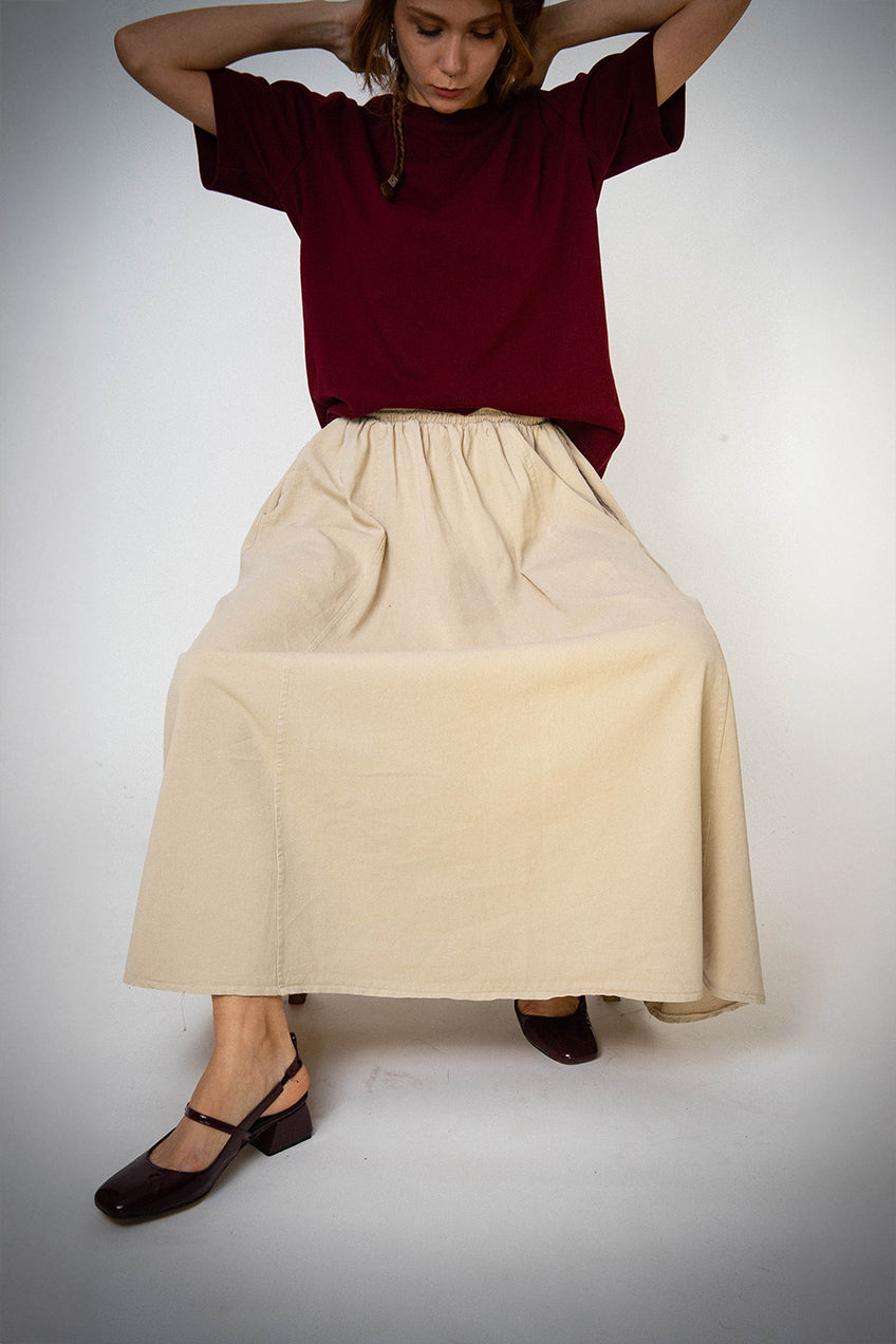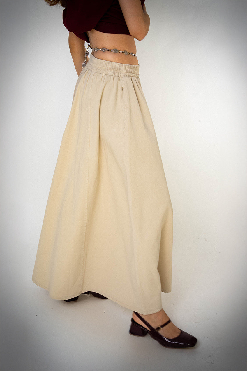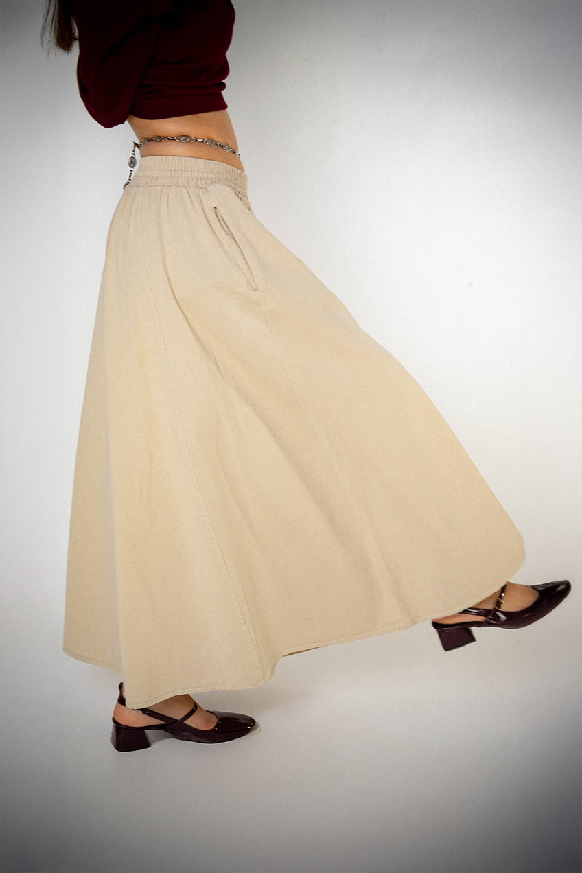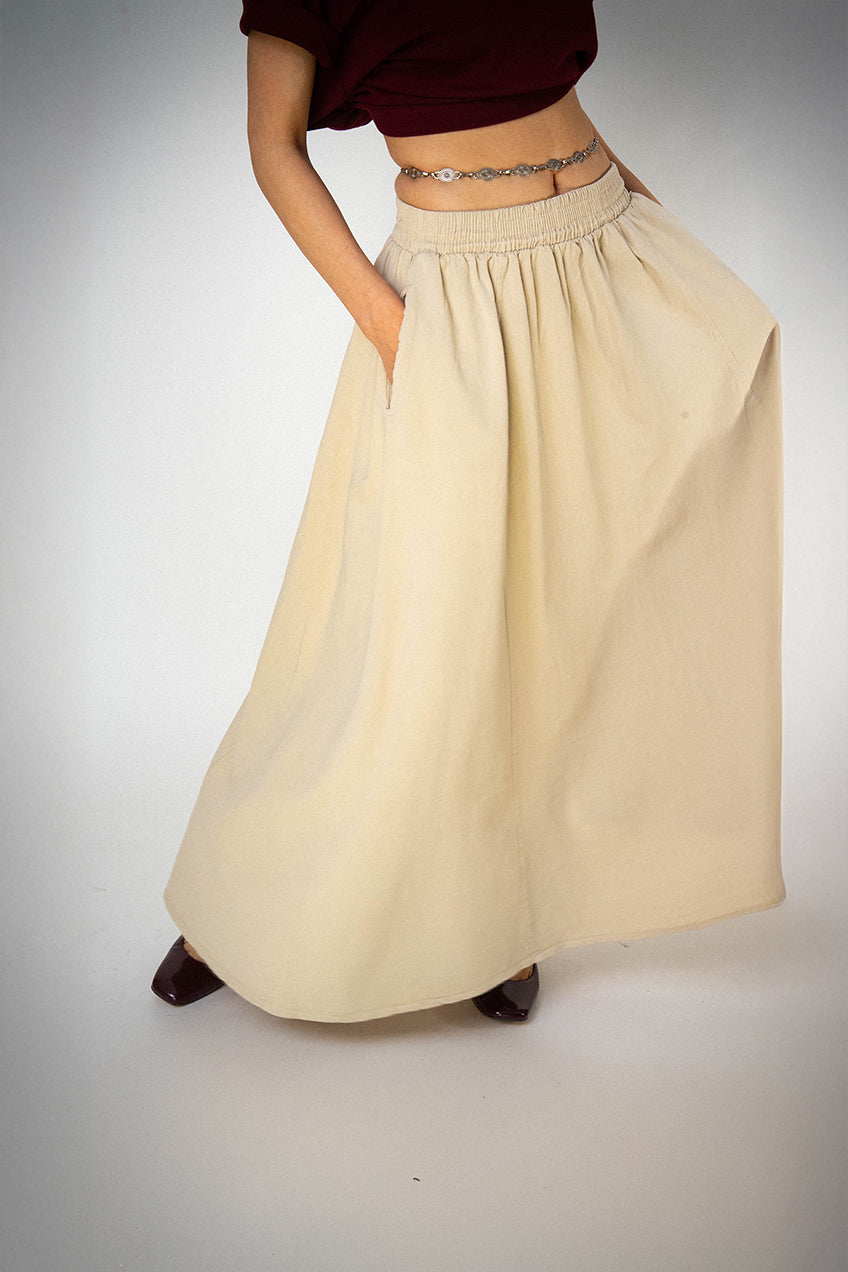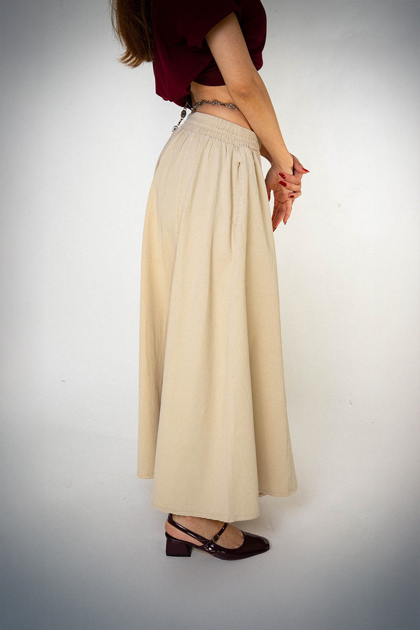 Gabardin Kloş Bilek Boyu Lastikli Krem Etek