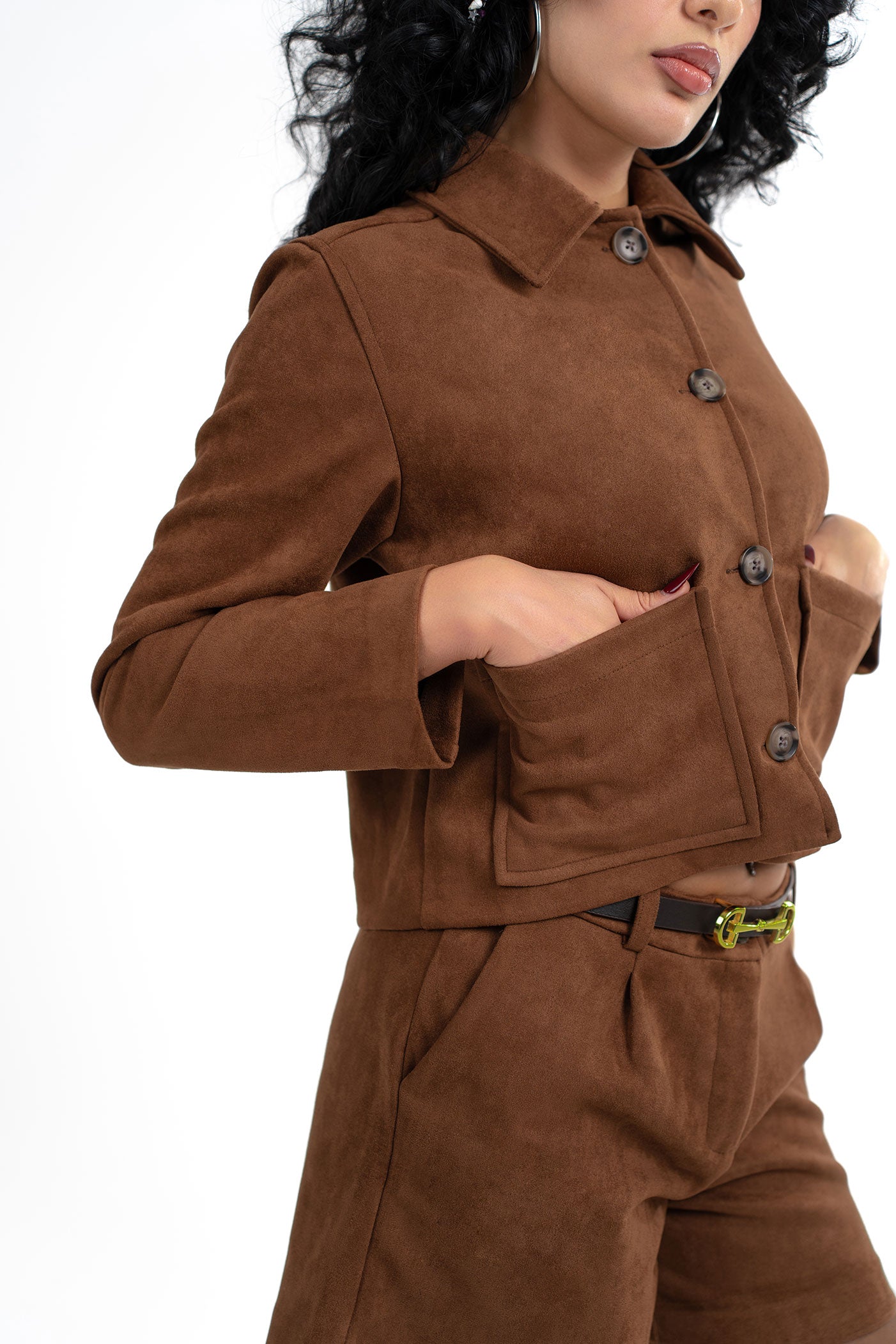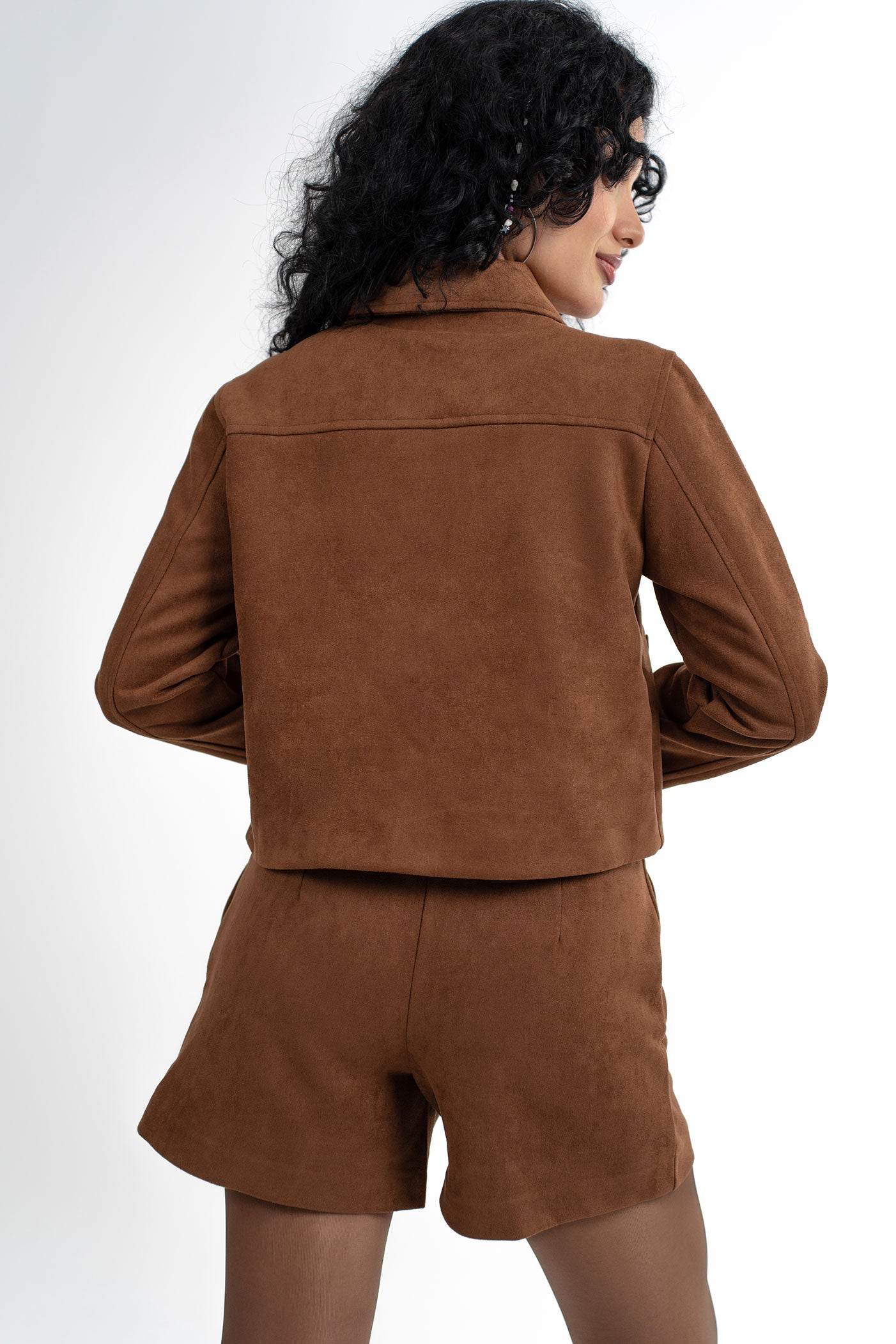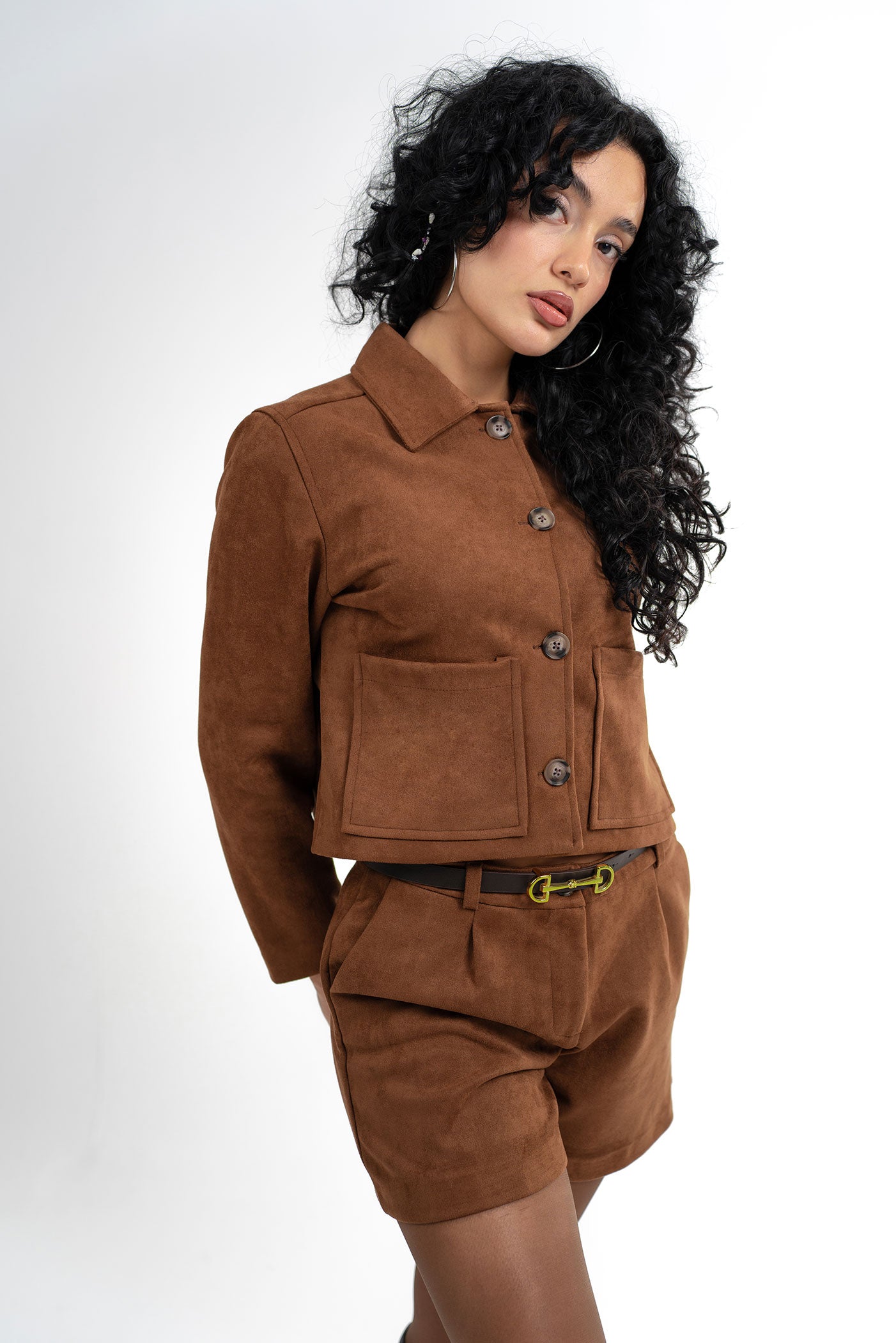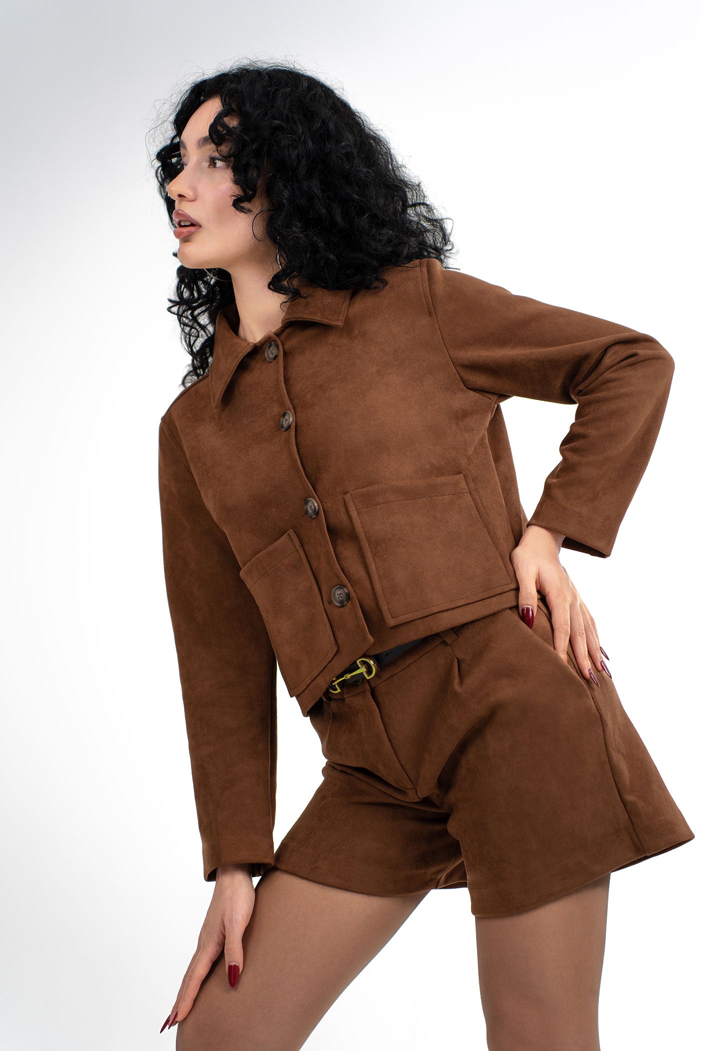 Şıklığı ve konforu aynı anda yaşamak isteyenler için tasarlanan bu süet ceket şort takım, gardırobunuzun en göz alıcı parçası olmaya geliyor. Süet görünümü ile lüks bir his, esnek dokulu kumaşı ile ise inanılmaz bir rahatlık sunar. Kısa ceket, büyük ön cepleri ve düğmeli kapamasıyla hem pratik hem de stil sahibidir. Takımın yüksek bel şort'u ise tokalı, ayarlanabilir deri kemer detayı ile vücudu mükemmel şekilde sararak zarif bir siluet çizer. Bu takım, "tok duruşu" ve "yumuşak dokusu" ile öne çıkarak özel günlerden gündelik kullanıma kadar geniş bir yelpazede sizi şıklığınızla fark ettirecek.